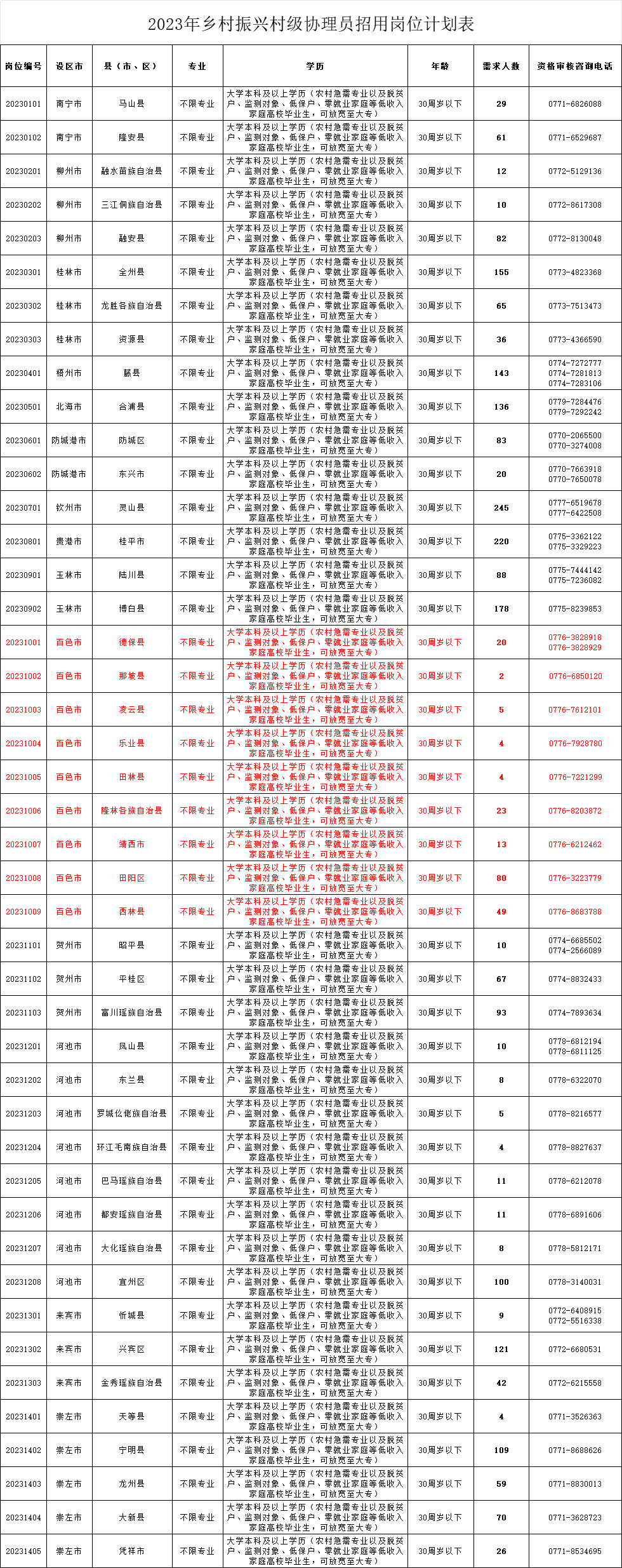 2023年,广西计划面向社会公开招用乡村振兴村级协理员2530名。现将招用考试有关事项公告如下: 01 招用岗位及职责 02 招用对象及条件 (一)招用对象。 国家统一招考的广西区内2023届高校毕业生及2021届、2022届未稳定就业的高校毕业生、区外广西籍2023届高校毕业生。 (二)招用条件。 1.具有中华人民共和国国籍,拥护中华人民共和国宪法。 2.思想政治素质好,拥护党的路线方针政策,有志于投身乡村振兴事业,服务基层人民群众,遵纪守法,服从安排,具有较强的组织纪律观念。 3.一般应具有国家承认的大学本科及以上学历。农业类、林业类、环境保护类、城乡规划与管理类、水利类、医药卫生类、财经商贸类、法律类等农村急需的专业(具体专业目录详见附件2),学历可放宽至大专;脱贫户、监测对象、低保户、零就业家庭等低收入家庭高校毕业生,学历可放宽至大专。2023届高校毕业生、非普通高等学历教育的其他国民教育形式(如自学考试、成人教育、网络教育、夜大、电大等)毕业生须在报名截止时间前取得相应的毕业证。技工院校高级工班、预备技师(技师)班毕业生可分别按相当于大专、本科学历报考。 4.30周岁以下(1993年9月8日后出生),具有正常履行职责的身体条件、心理素质和工作能力。 5.凡有下列情形之一的,不得报名: (1)曾受过刑事处罚的,或曾受过开除中国共产党党籍等党纪政务处分的; (2)正在接受纪律审查或监察、司法调查尚未做出结论的; (3)被依法列为失信联合惩戒对象的; (4)各类考试违规违纪在禁考期内的; (5)在读的普通高校非2023届毕业生(其中,在读的非2023届毕业的专升本人员、研究生不得以已取得的学历、学位证书报考)。 (6)违反有关规定不适宜招用的其他情形。 03 招用程序 (一)查询岗位。 招用岗位详见《广西2023年乡村振兴村级协理员招用岗位计划表》(附件1)。 (二)网上报名(9月8日9:00—9月14日17:00)。 报考人员通过广西人事考试网(www.gxpta.com.cn)进行网上报名,不设现场报名。 报考人员须在规定期间完成网上报名工作,每名报考人员只能报考一个岗位。 (三)查询资格审核结果(9月8日9:00—9月15日12:00)。 报考人员登录网上报名系统查询资格审核结果。报名确认后尚未进行资格审核或已通过资格审核的,不得再修改报考信息或改报其他岗位。报名确认前或未通过资格审核的,在报名时限内,可修改报考信息。〔招用岗位要求的学历、专业等资格条件方面的问题,由各县(市、区)负责解释〕 因网上报名提交的材料不真实、不完整或错误填写报名信息,造成网上资格审核及后续资格复审不通过的,由报考人员自行承担责任。 (四)笔试。 1.打印准考证:考生于9月20日8:00后登录报名系统打印本人准考证。 2.笔试时间:9月23日9:00—11:00 。 3.考试地点:设在各设区市人民政府所在地,详见准考证。 4.笔试内容:笔试科目为《综合知识》,题型为客观题,分值100分。 5.笔试成绩查询:考生于10月10日9:00后登录报名系统查询本人笔试成绩,同步在广西人事考试网查询合格分数线。 6.相关要求:笔试当天考生须携带本人准考证和有效居民身份证(身份证号码与报名系统信息一致)。 (五)面试。 1.查询面试入围情况(10月11日18:00前):按照招用岗位计划数1:2的比例,依据笔试成绩,从高分到低分确认面试入围人员,并在县(市、区)人民政府网站、人力资源社会保障、乡村振兴等部门网站公布,考生自行查询面试入围情况。 2.面试资格复审:面试入围的考生,按照各县(市、区)公布的面试资格复审的形式和要求参加复审,对复审不通过或未在规定时间内参加复审的,取消考生面试资格。 3.面试时间:10月21日8:30开始。 4.面试地点:详见面试通知书。 5.面试结果公布:面试分值100分,面试结束后,当天在考点公布面试成绩。 (六)体检(10月下旬)。 按照招用岗位计划1:1的比例,依据总成绩(笔试、面试成绩权重各占总成绩的50%)从高分到低分确定体检人选(总成绩相同的,以笔试成绩从高分到低分确定)。体检标准和项目参照事业单位公开招聘人员体检标准和项目执行,但对静止型、轻型地中海贫血不影响正常工作的考生(轻度贫血,血红蛋白大于90g/L),体检可予以合格结论。报考人员不按规定时间、地点参加体检的,视作放弃。对按规定需要复检的,不得在原体检医院进行,复检只能进行1次,复检费用由其本人承担,结果以复检结论为准。 (七)公示(10月下旬)。 根据考试成绩、体检结果等材料,确定拟招用人员名单,在县(市、区)人民政府网站、人力资源社会保障、乡村振兴等部门网站公示。公示期不少于5天。期间,拟招用人员向所在县(市、区)人力资源社会保障局提供毕业院校或户籍所在地村(社区)推荐意见表(附件3)。根据推荐意见和公示结果,确定2023年乡村振兴村级协理员招用人员名单。 (八)岗位分配及递补调剂。 根据工作需要,结合人员专业特长,按照人岗相适、公平公正的原则进行岗位分配。出现岗位空缺的,根据总成绩从高分到低分递补,递补后仍不足的,在设区市范围内调剂。 04 福利待遇 (一)劳动报酬和社会保险等待遇。乡村振兴村级协理员每人每月工资4350元、交通补贴300元;依法参加社会保险,并按规定缴纳住房公积金。社会保险、住房公积金单位缴纳部分由所在县按规定统一组织缴纳,并购买商业意外保险。 (二)休息休假。享有国家和自治区规定的休息休假权。 (
