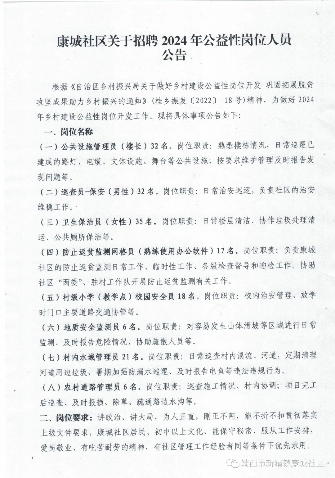 靖西康城社区关于招聘2024年公益性岗位人员公告